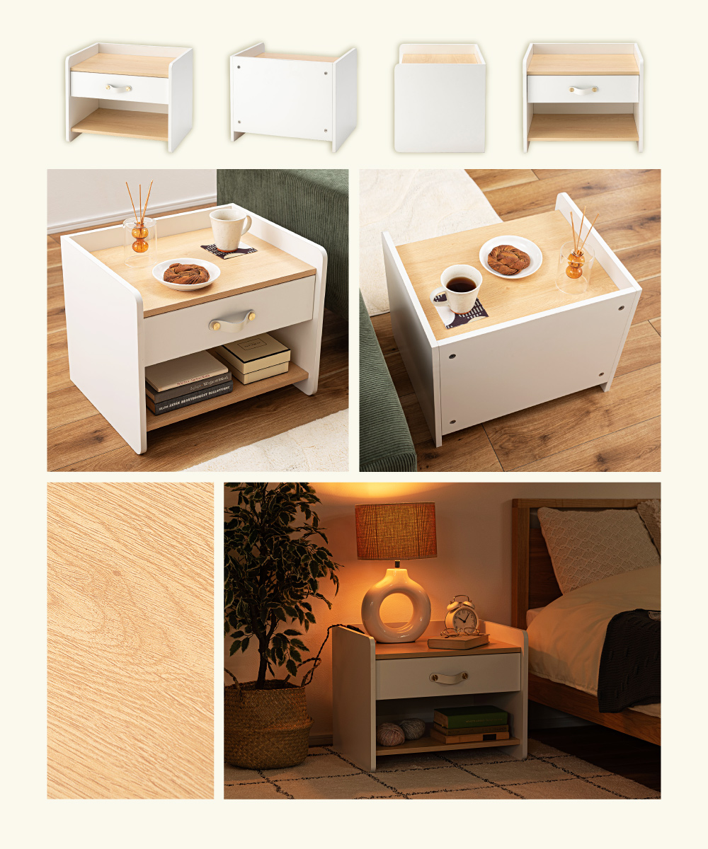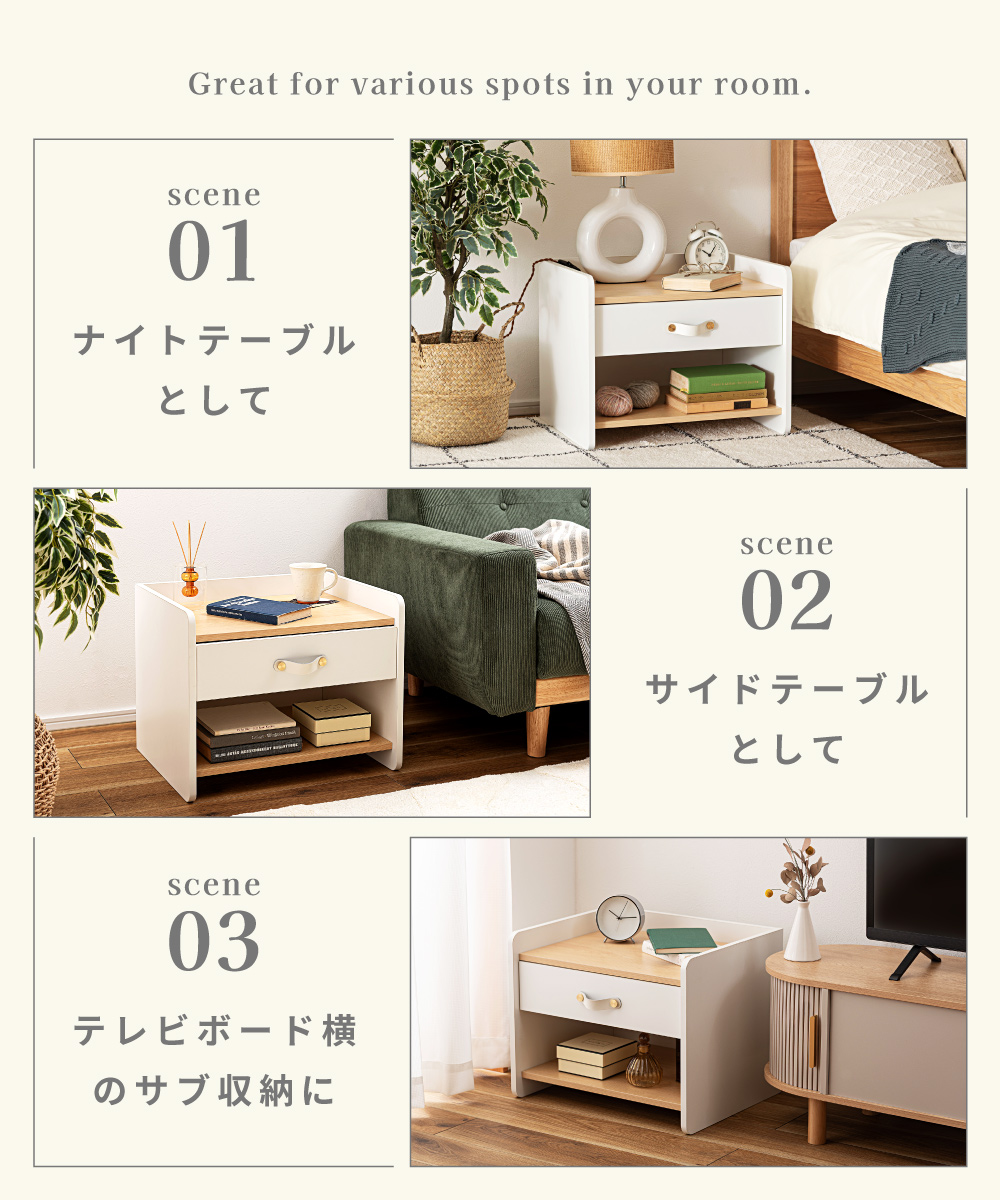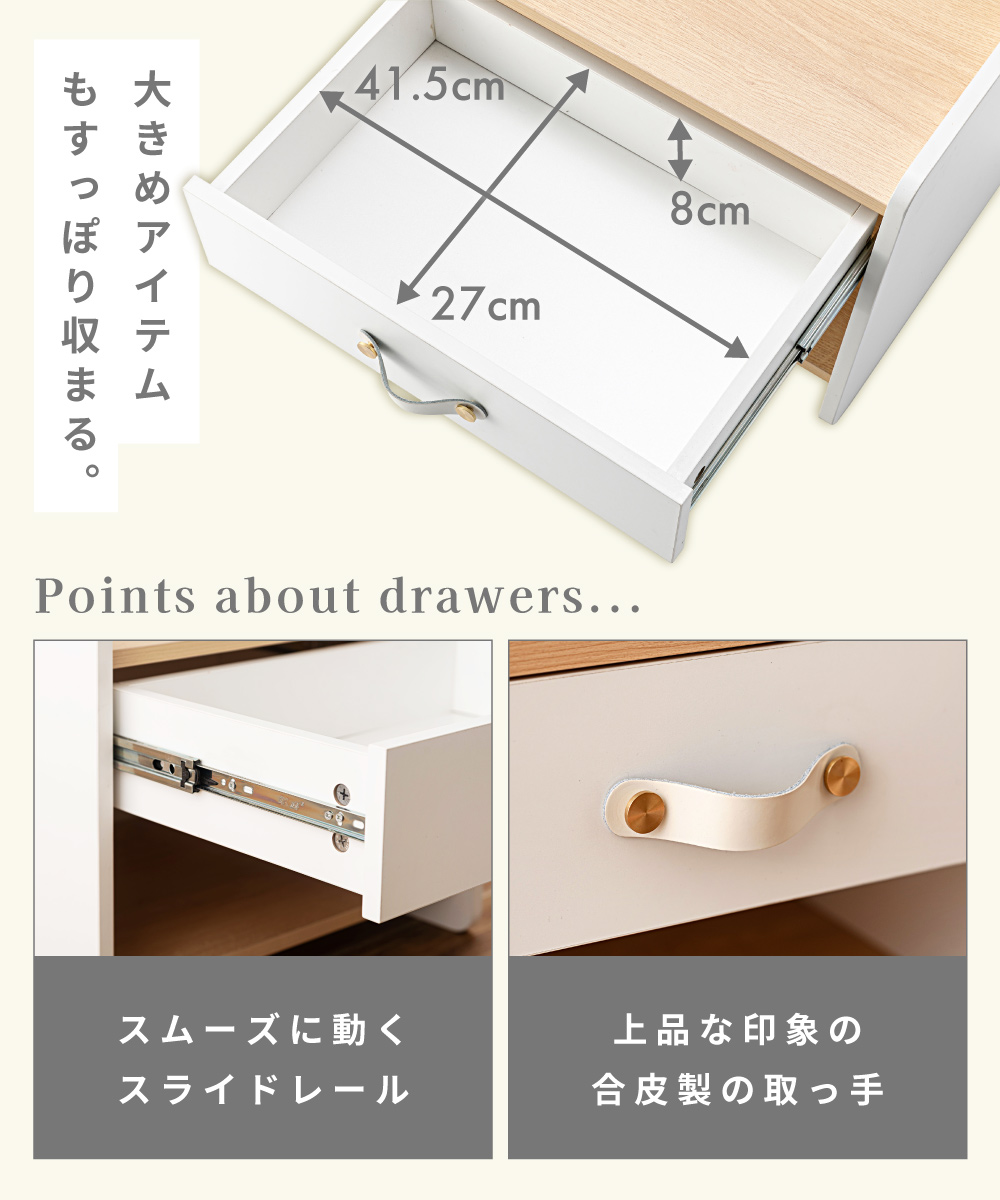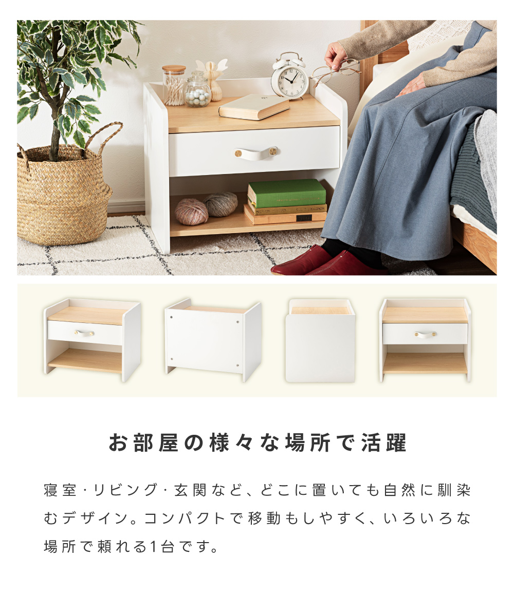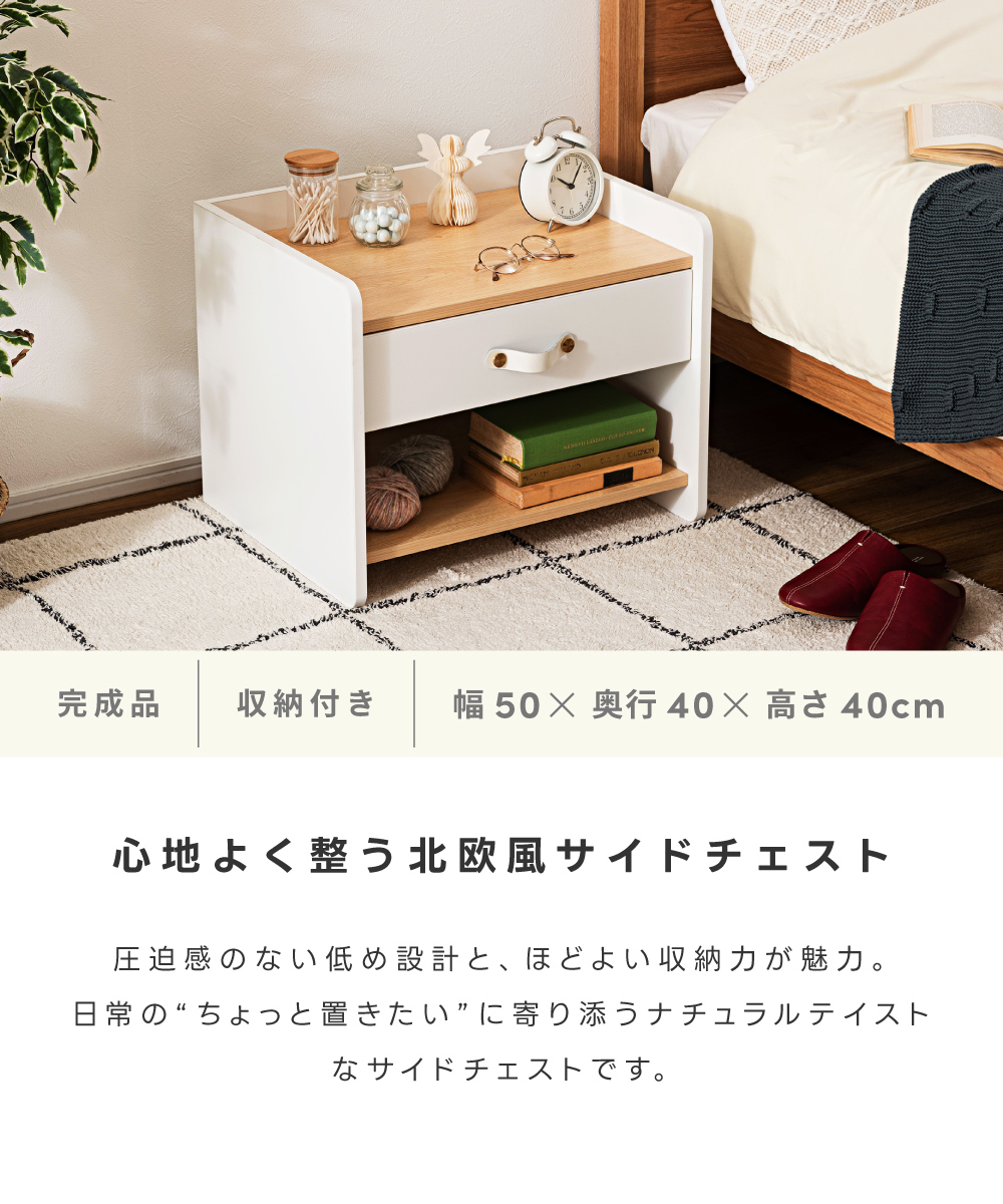 | ポイント | 圧迫感のない低め設計と、ほどよい収納力が魅力の北欧風サイドチェスト ●リアルな木目調×ホワイトの北欧テイスト ナチュラルで上品な雰囲気が、お部屋を明るく整えてくれます。 ●お部屋に開放感を与える低め設計 ベッドやソファ横でも視界を遮らないため、圧迫感が出にくくほどよい抜け感をつくります。 ●天板は小さすぎない丁度いい広さ 目覚まし時計や大きめのテーブルライト等を置いても余裕があるため、ナイトテーブルとしても◎ ●便利な引き出し・オープン収納 引き出しには細かな生活雑貨を、オープン棚には本やリモコンなどよく使う物を。 『見せる』と『隠す』を分けて、お部屋をすっきり保てます。 ・スムーズに動くスライドレール ・上品な印象の合皮製の取っ手 |