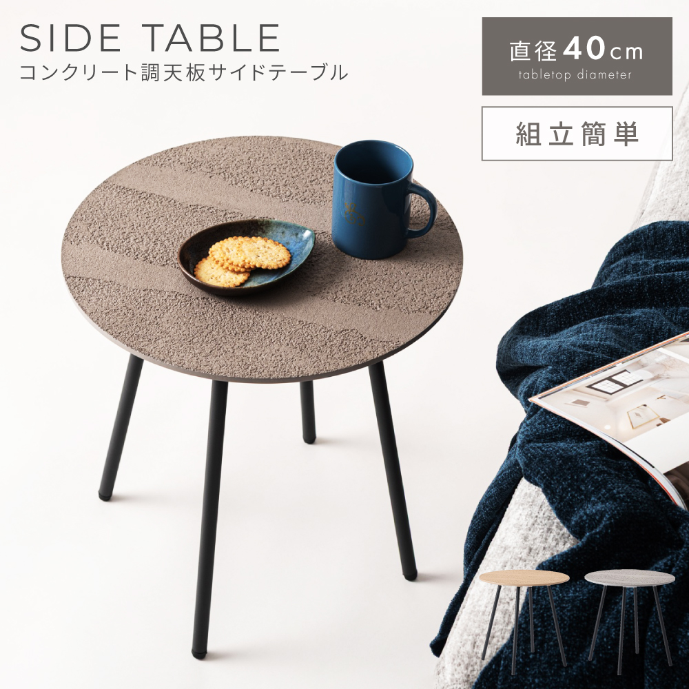 | ポイント | ●コンクリート調天板の「凹凸」デザインが魅力なサイドテーブル 表面には微細な凹凸を施しており、コンクリート調の質感が上品なニュアンスを醸し出します。 無機質すぎず、どこか温かみのある仕上がりが、魅力です。 ●スチール脚のシャープな印象 細めのブラックスチール脚は、天板の素材感を引き立てつつも空間を軽やかに演出。 マット仕上げの粉体塗装が、金属特有の冷たさを和らげます。 ●シーンに馴染む40cmサイズ 直径40cmの天板は、グラスや本、アロマなどを置くのにちょうどよいサイズ。 省スペースながら、使い勝手の良さが光ります。 |