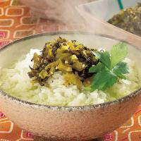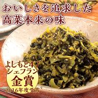 | 原材料名 | 高菜(中国、国産)、漬け原材料【しょうゆ、糖類(砂糖・ぶどう糖果糖液糖、水あめ)、ごま、食塩、醸造酢、発酵調味料、ウコン粉、かつおエキス、唐辛子】/調味料(アミノ酸等)、酸味料、着色料(クチナシ)、酸化防止剤(ビタミンC)、甘味料(ステビア)、(一部に小麦、大豆、ごまを含む) |