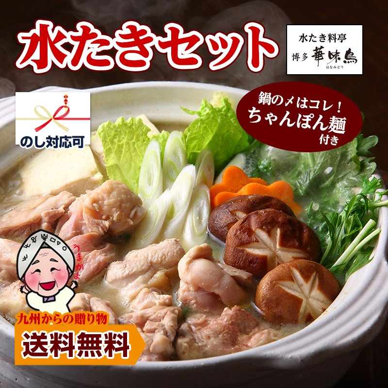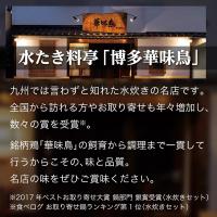 | セット内容 | 博多華味鳥 水たきセット ・水たき生スープ 600g×2 ・華味鳥 切り身 300g×1 ・華味鳥 ぶつ切り 300g×1 ・華つくね 200g×1 ・博多ぽん酢 220ml×1 ・ちゃんぽん麺 150g×1