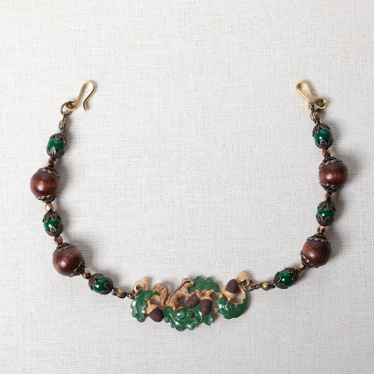 シマリスがどんぐりを収穫しているシーンを切り取った羽織紐は、ビーズで深い森やどんぐりを表現したボリュームのあるデザイン。