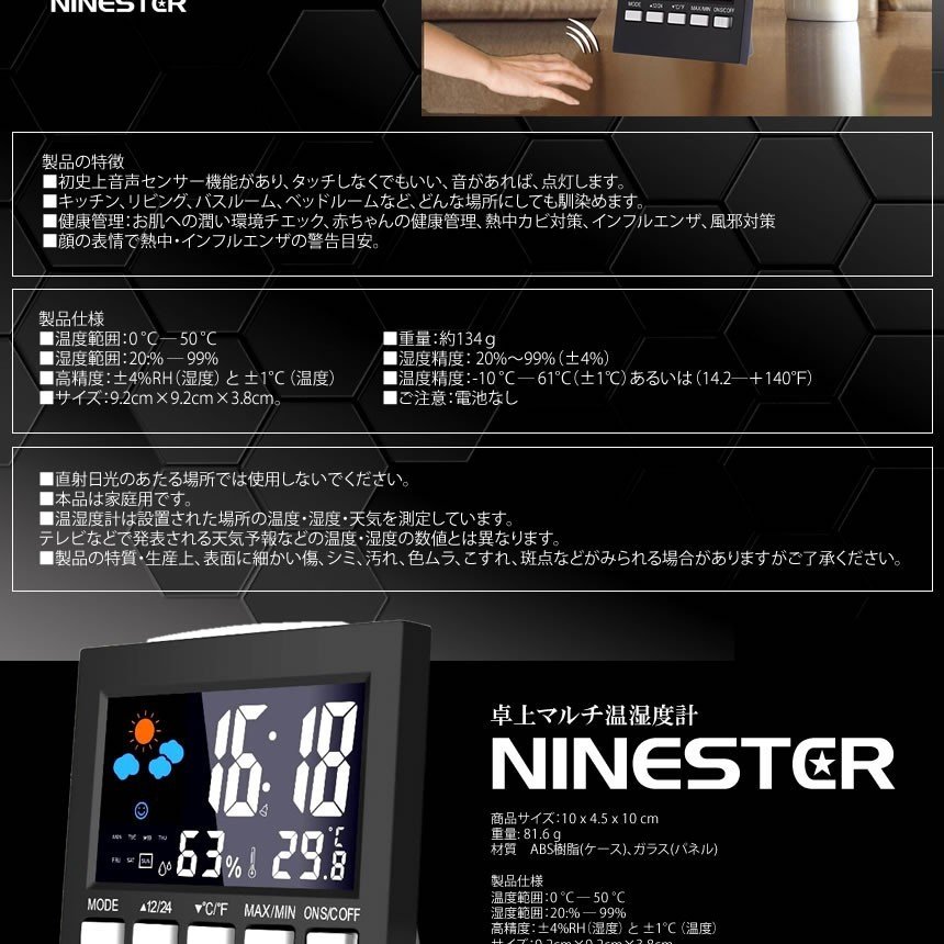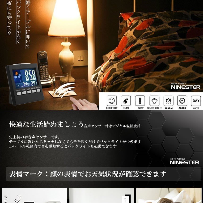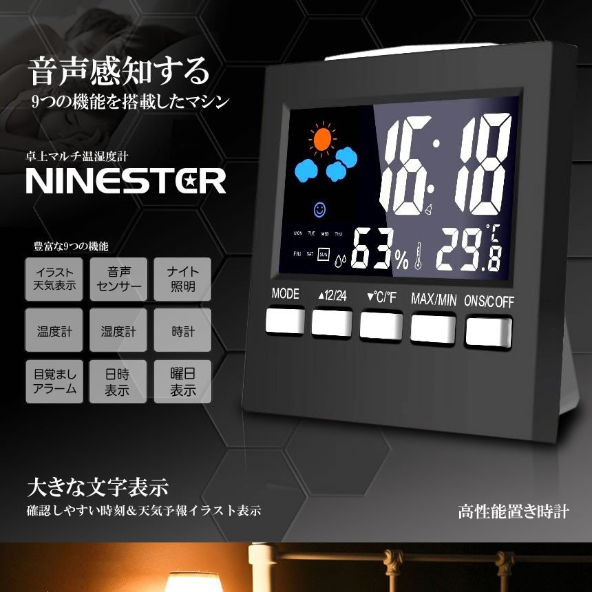 温度、湿度、目覚まし時計、日付、時間、