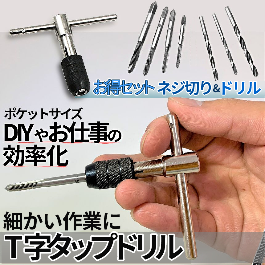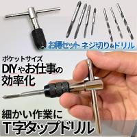 セット内容:T型タップハンドル×1(ネジ切りタップ専用)、ネジ切りタップ×4本、下穴ドリルビット×4本