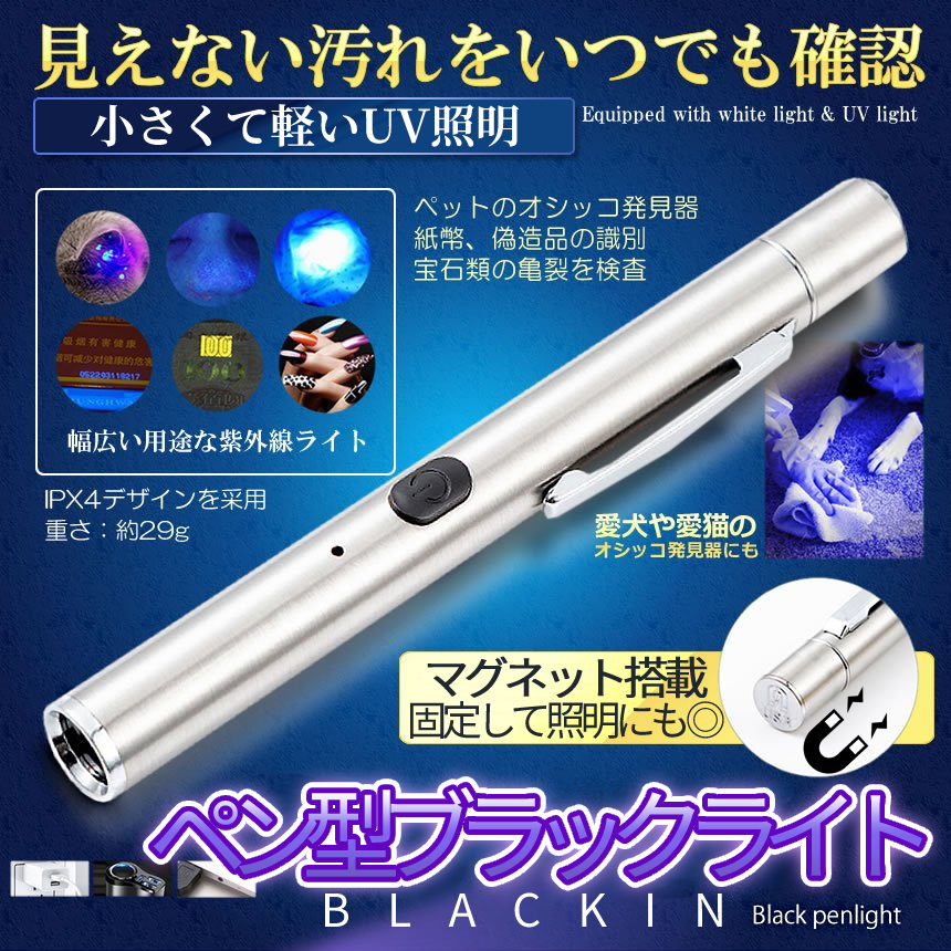 ペン型 UV ライト ブラックライト 紫外線 LEDライト USB 充電 マグネット 磁石 コンパクト 懐中 電灯 軽 検査 識別 鑑定 IYP365 波長 細菌 ペット 犬 猫 BLACKIN