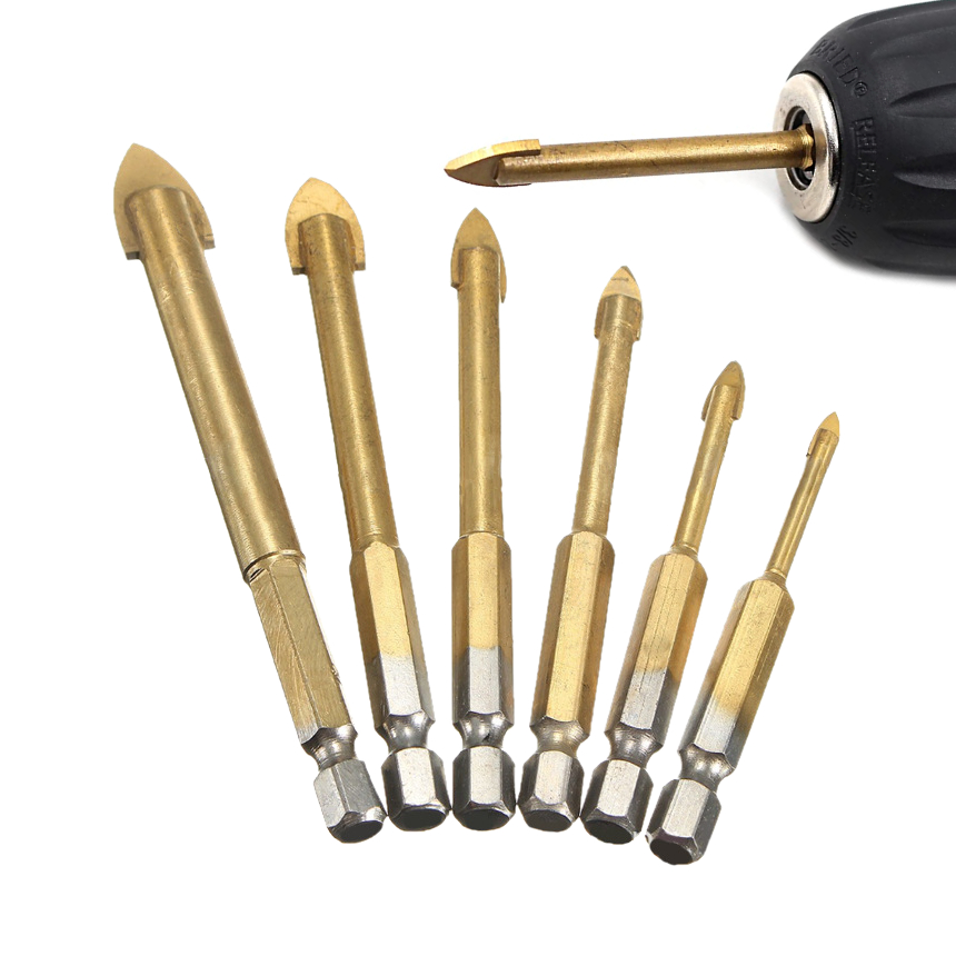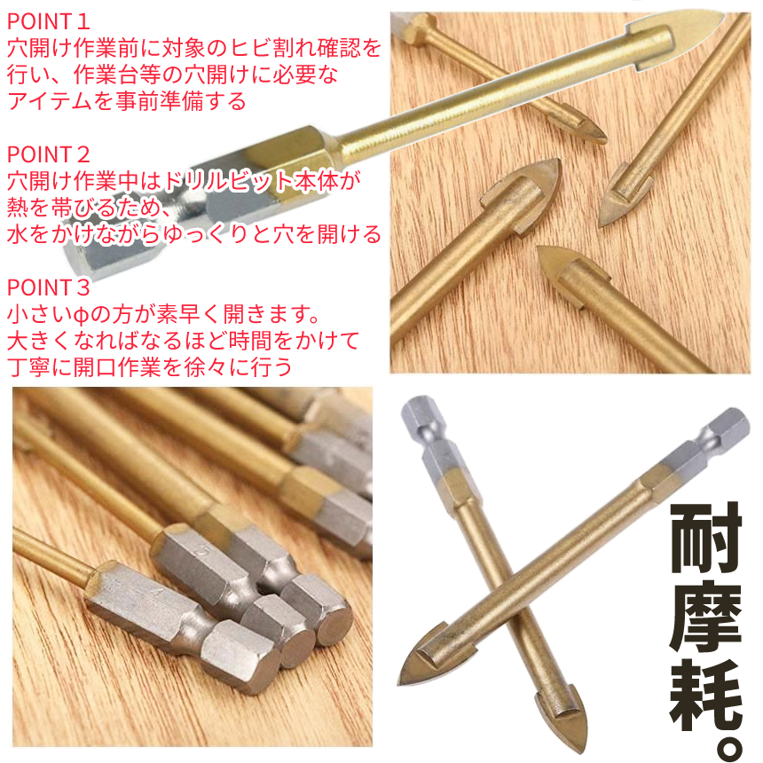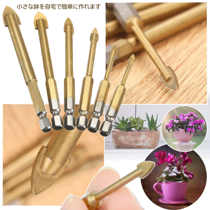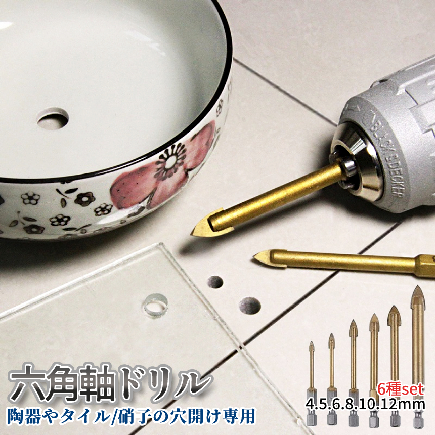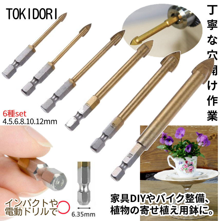 陶器 穴あけ ドリル ビット 6本セット 4.5mm-12mm タイル 鉢 穴開け ドリルビット ガラスドリル 穴 掘削 ガラス スレート 硝子 DIY 工具 六角軸 6.35mm TOKIDORI
