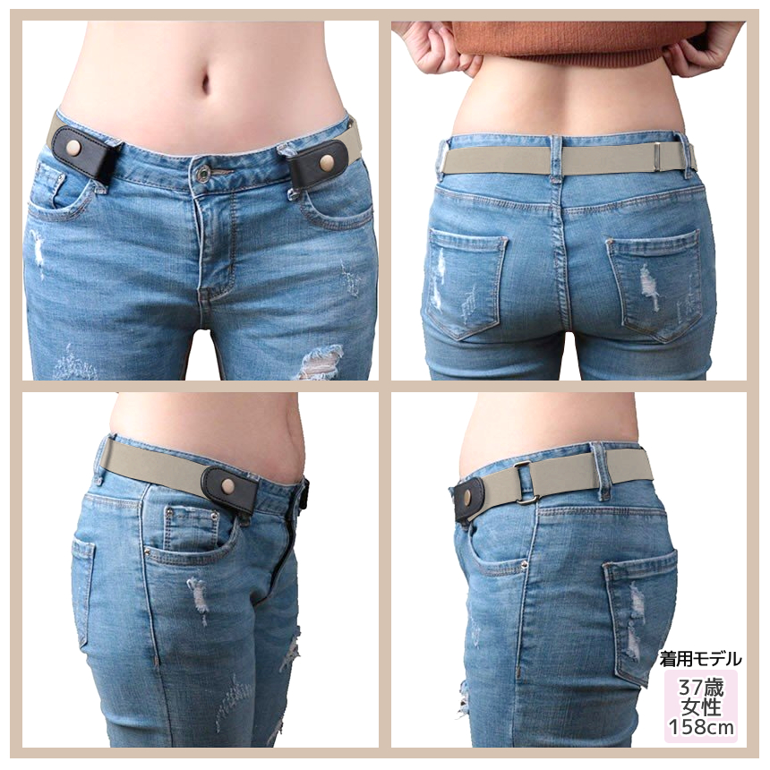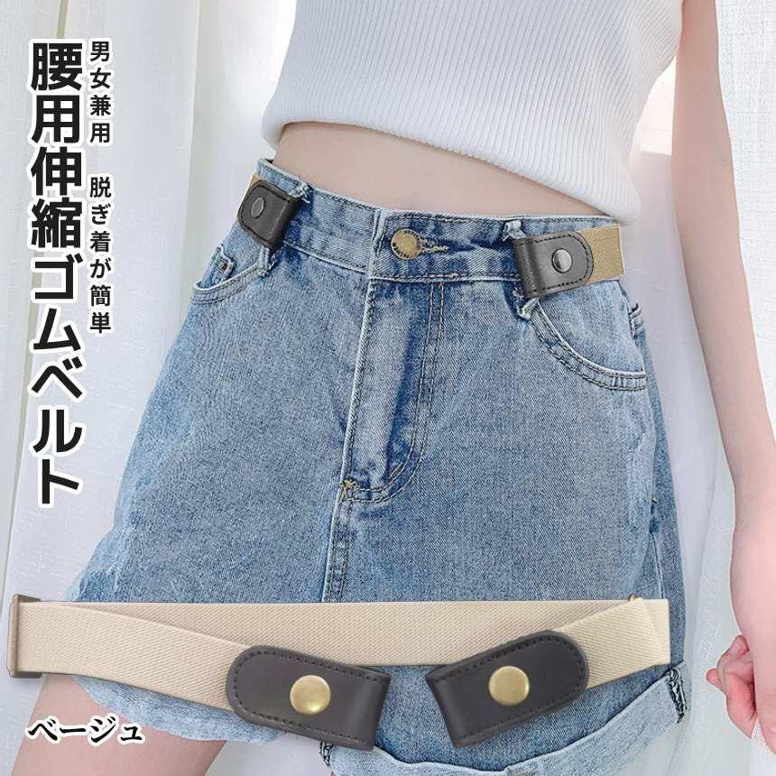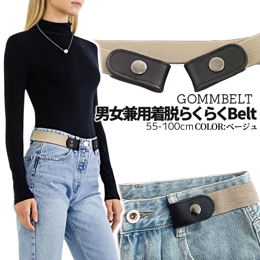 ベルトループ(ベルト通し)にゴムベルトの両端をパチンととめるだけ、