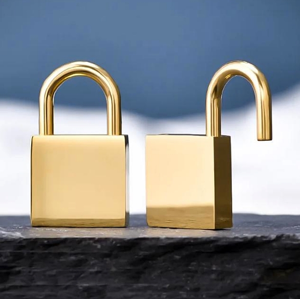 光沢があり高級感のある8Gの南京錠のボディピアスです。南京錠の中にスプリングが入っており、引っ張ると開き離すと元に戻るような仕様です。重さは約14gになり、そのまま使用できますがホールトゥとしても使用できます。ネックレスのトップとしても使えるような完成度の高いデザインです。※この商品は1個売りです。