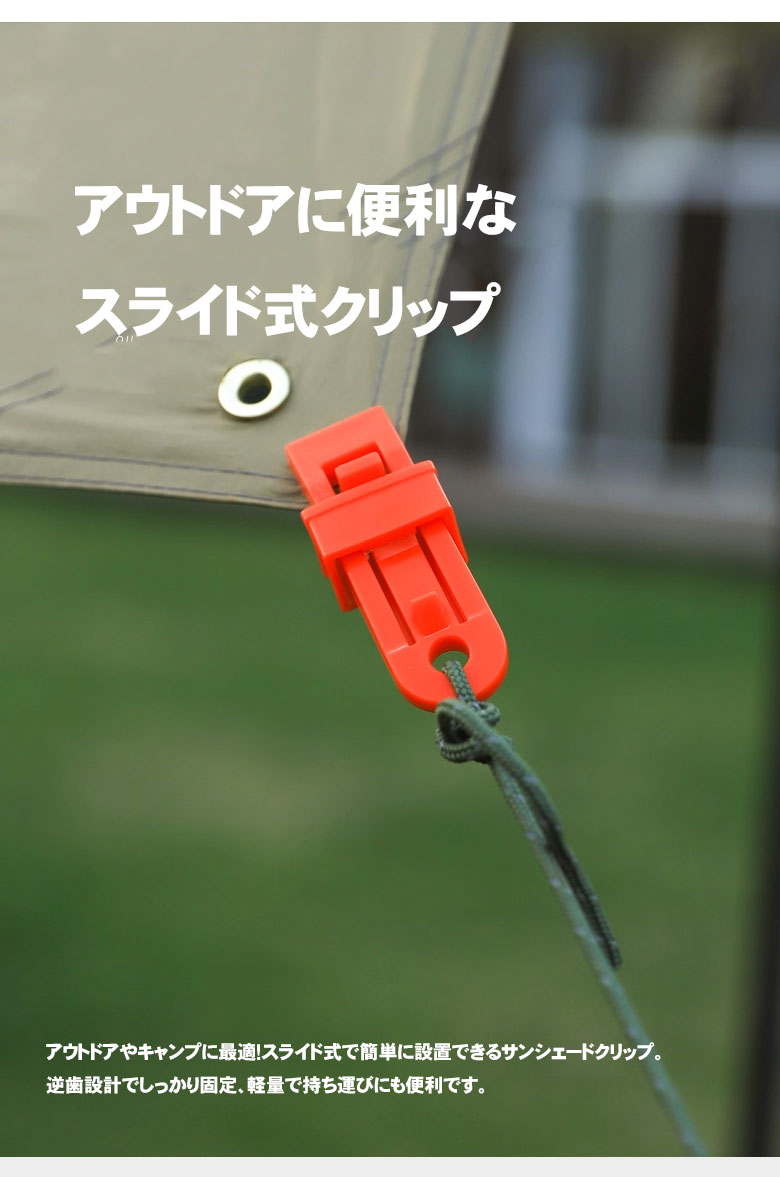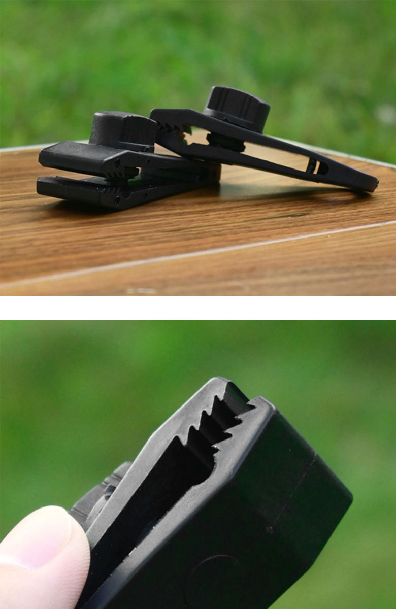 日常生活の暖簾を固定したり、アクセサリーを固定したり、物を掛けたりするなど、固定しなければならない場合は使用できます。アウトドアキャンプ、テント、キャノピー、天幕、防水シート、グランドシート固定用、屋外の設営、 バーベキューに適用。またはタオルや帽子を干すときの洗濯バサミ代わりとしても使用可能です。キャンプなどのアウトドアシーンで便利なタープクリップを、ぜひ様々な場面でお役立て下さい。
