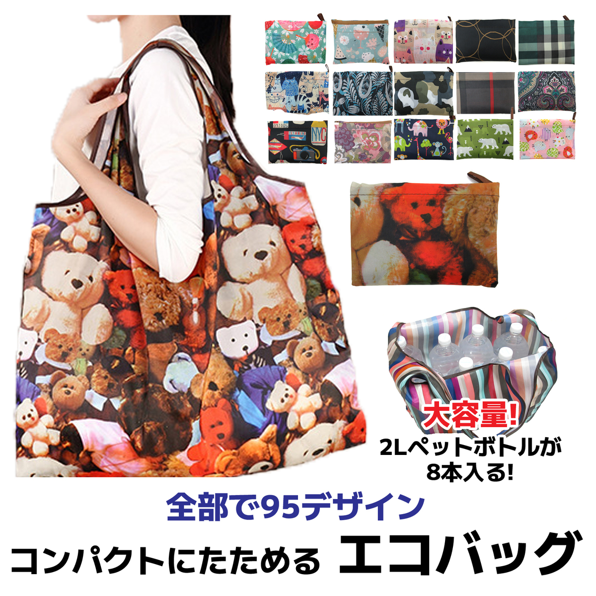 2Lのペットボトルが8本入る大きさで、お買い物する時は大きく広げて沢山の荷物をすっきり収納可能♪