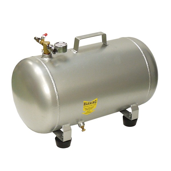 特長25Lアルミエアータンク エアーの注入口はコック付きエアープラグなので充填も楽です。 タイヤの空気入れ、出張作業時に携帯するのにも軽くて便利です。 エアーの取り出し口は1/4のエアーカプラー付きなのでタイヤゲージやお持ちのエアー工具が使用できます。 容量の少ないコンプレッサーのサブタンクとしてもご使用いただけます。 タンク内圧力計が付いていますので、ご使用状況が確認できます。 タンク底部にドレーンプラグが付いているのでタンク内部に溜まった水の排出もできます。安全弁付きです。仕様● タンク容量 : 25リットル ● 使用空気圧 : 8.0 kgf/cm2(0.78MPa) 未満 ● タンク内圧力ゲージ付き ● 空気吐出口 : 1 ケ所 ● 吐出口 ストップボールバルブ付き ● 日東型20SFカプラ付き(シールテープを使用してください。) ● 空気入力口 : タンク上部 ( 逆止弁付き ) ● 下面 水抜きバルブ付き ● 本体重量 : 4.2kg ● 本体寸法 : 幅 260 × 奥行き 500 × 高さ 300 mm (地面からタンク底部まで35mm) ● PL 製造物責任保険加入済み