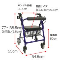 ●サイズ/幅54.5×奥行55×高さ77〜88.5(6段階/2.5cm)cm、折りたたみ時:奥行42×高さ89cm、座面:幅33×奥行30.5cm、座面高:50cm、ハンドル内幅:39.5cm