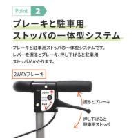 ・両輪ブレーキ&2WAYブレーキ搭載。ブレーキとストッパーの一体型システムで、レバーを握るとブレーキ、押し下げると駐車用ストッパーがかかります。
