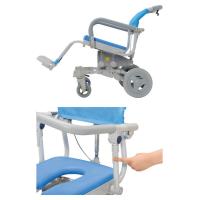 ・ひじ掛けが前倒れ防止に。シートを傾けて座位を安定。コンパクトなシャワーキャリー。