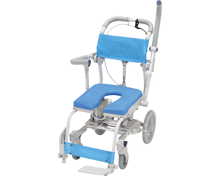 ・ひじ掛けが前倒れ防止に。シートを傾けて座位を安定。コンパクトなシャワーキャリー。
