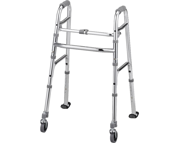 ・前輪が自在キャスターですので、方向転換が楽に行えます。後輪には歩行速度を抑制するソリ足(傷防止カバー標準付属)です。