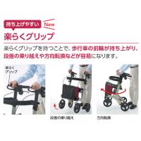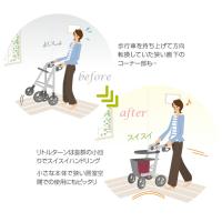 ・楽らくグリップを持つことで、歩行車の前輪が持ち上がり、段差の乗り越えや方向転換などが容易になります。