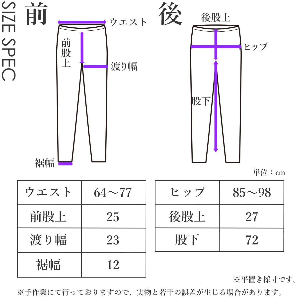 | サイズ | M〜L ウエスト64〜77cm ヒップ85〜98cm わたり幅23cm 前股上25cm 後股上27cm 裾幅12cm 股下72cm