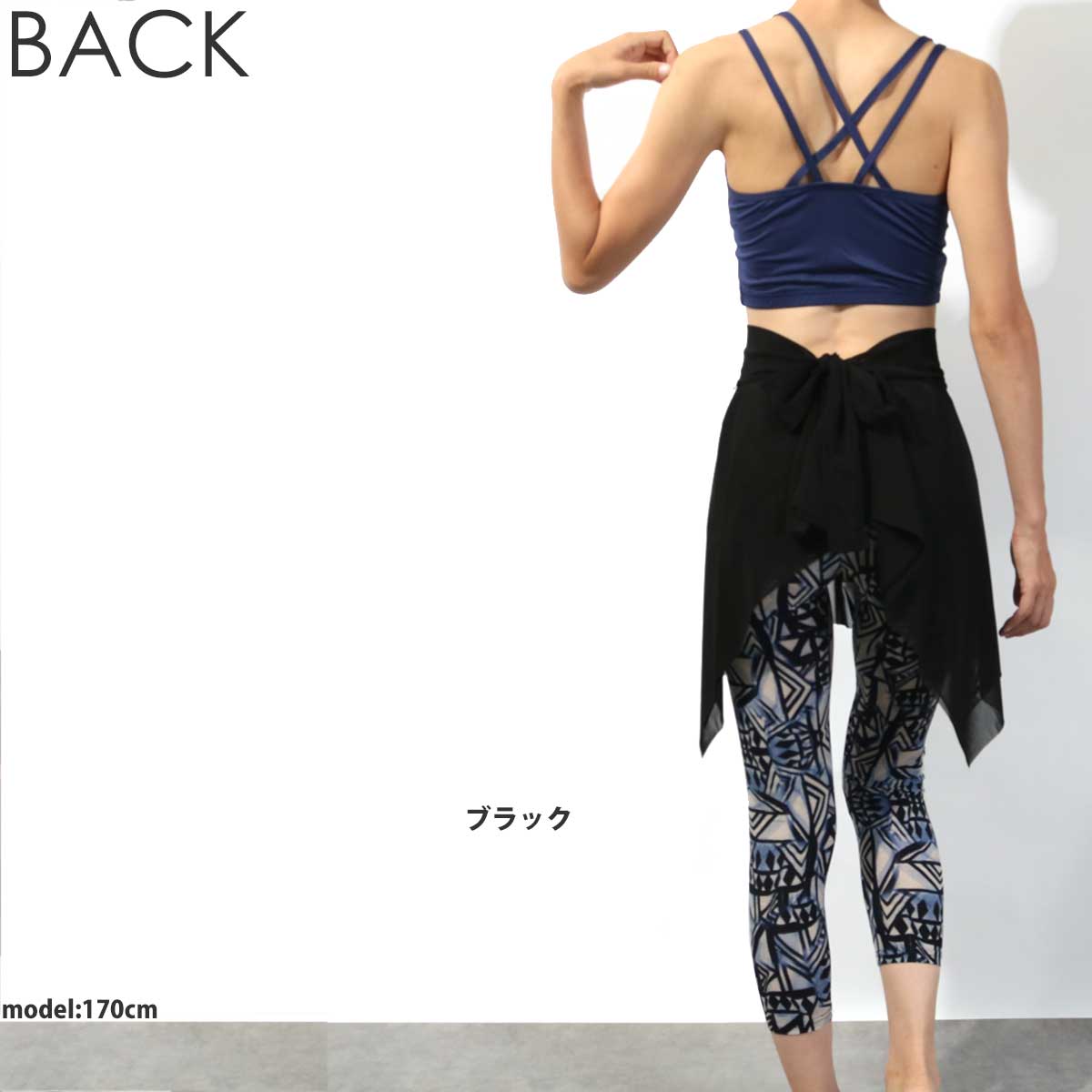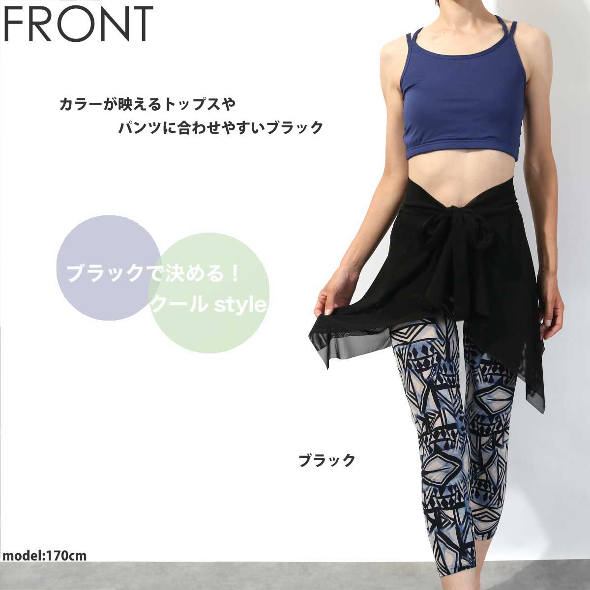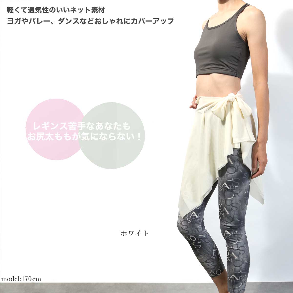 | スタッフのコメント | レギンスにレイヤードして気になるヒップをカバーする? 透け感のあるパワーネット素材を使用 フレアスカートのようなシルエット 簡単にさっと結ぶだけでヨガやジムの行き帰りにもオススメ 前結び 横結び 後ろ結びと1枚で3パターンのコーデを楽しめる |