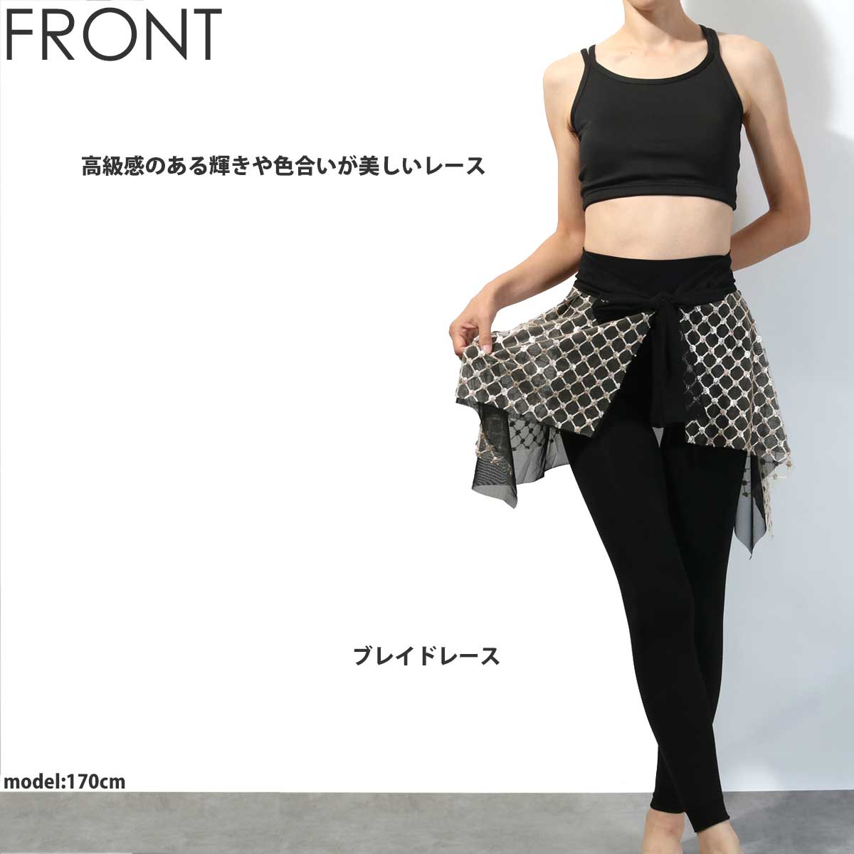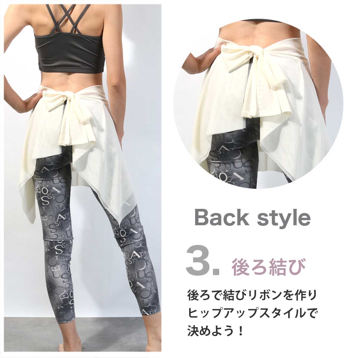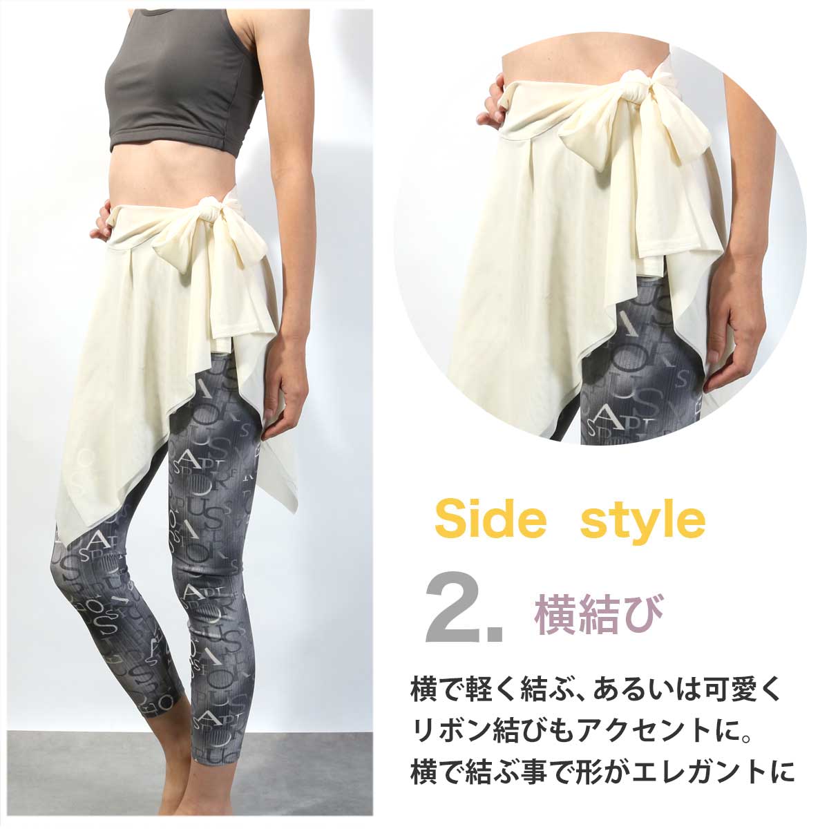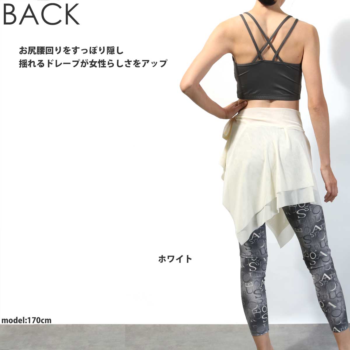 | スタッフのコメント | レギンスにレイヤードして気になるヒップをカバーする? 透け感のあるパワーネット素材を使用 フレアスカートのようなシルエット 簡単にさっと結ぶだけでヨガやジムの行き帰りにもオススメ 前結び 横結び 後ろ結びと1枚で3パターンのコーデを楽しめる |