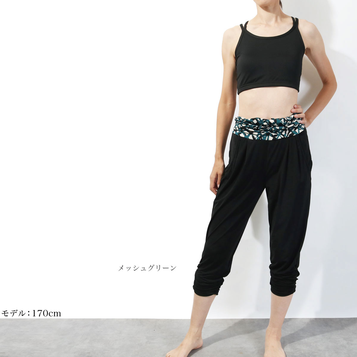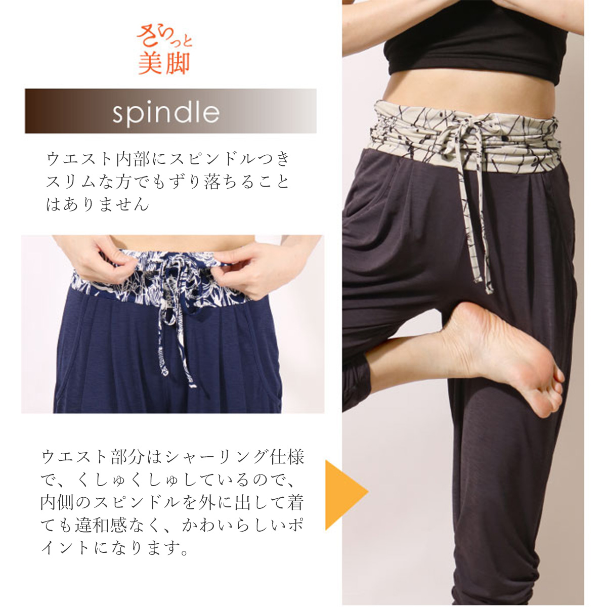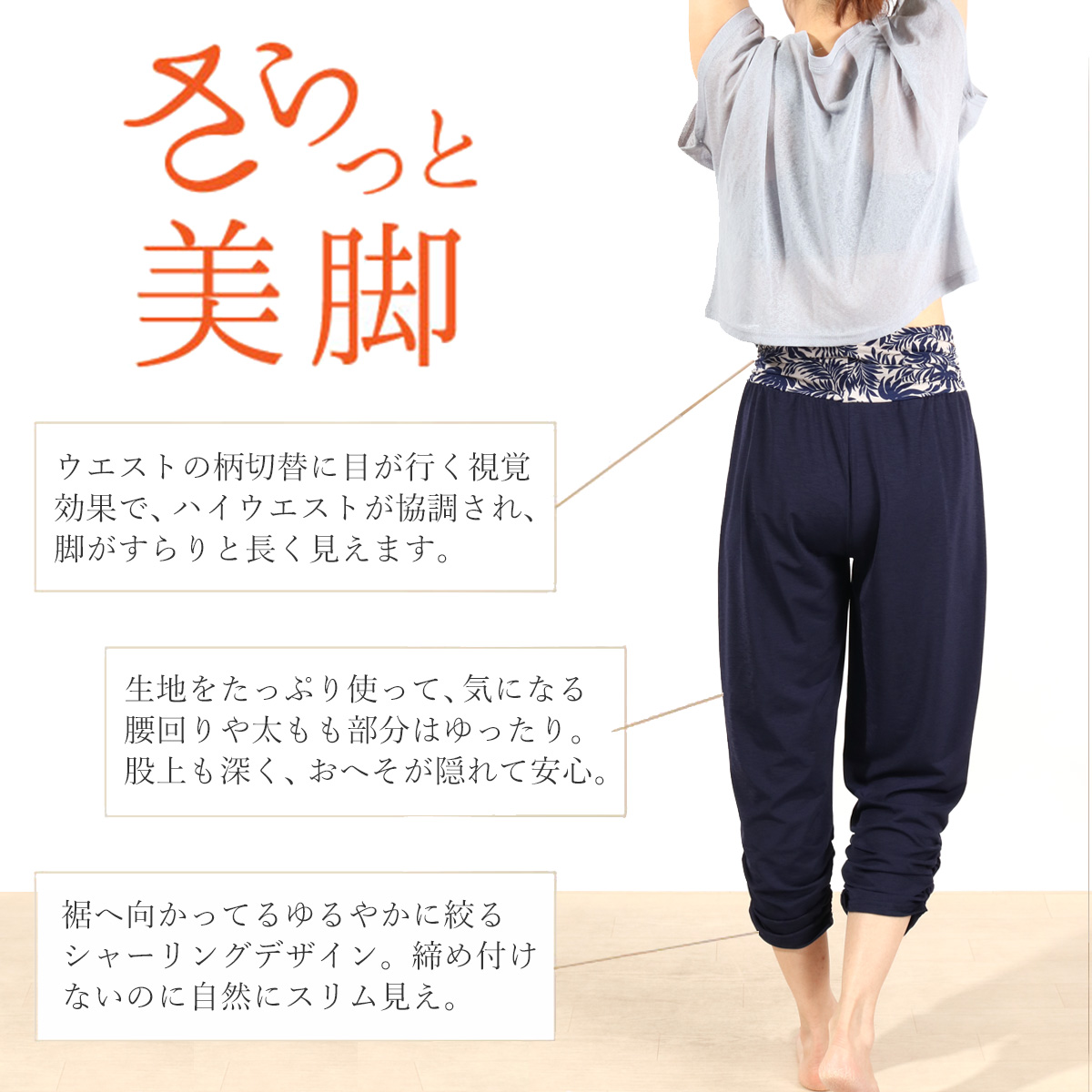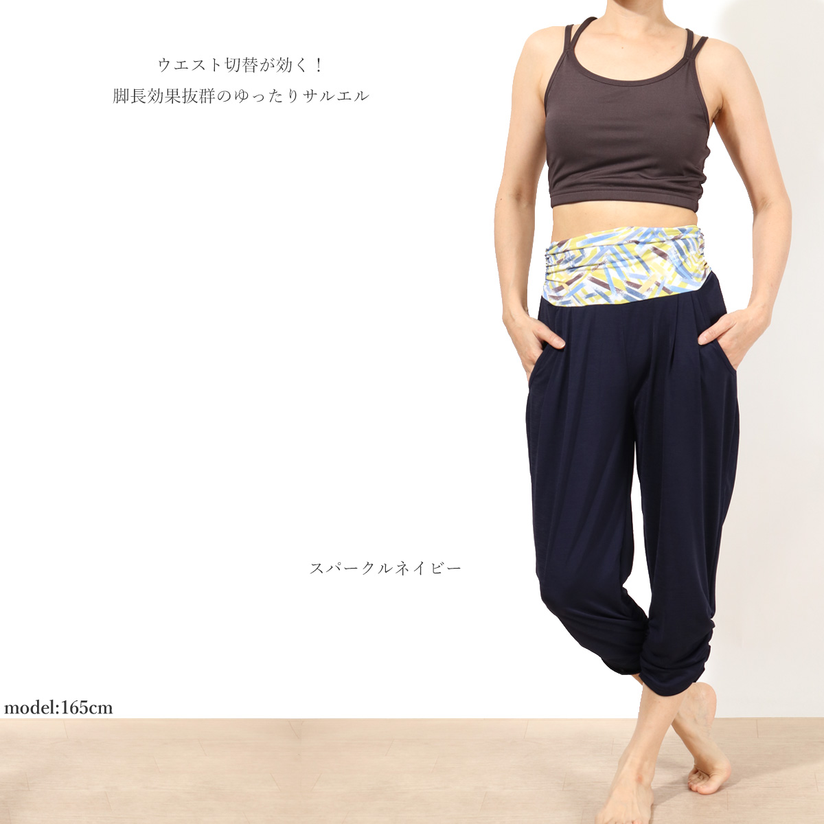 スタッフの コメント | ウエスト切替が効く!美脚シャーリングサルエルパンツ。すらっと見えするのに、タックつきで腰回りゆったりのサルエルパンツ。ハイウエストで脚長効果抜群、プリント柄のワンポイントがコーデを引き締めてくれます。シャーリングで軽く絞った裾は、見た目にも美しく、締めつけ感なしで快適。ウエスト内部にスピンドルつきなので、スリムな方でもずり落ちたりすることはありません。また、ウエスト部分はくしゅくしゅしているので、お腹周りをキレイにカモフラージュしてくれます。左右にサイドポケットつきで、ちょっとした小物を入れたりもできます。超軽量の吸汗ドライ素材で、ヨガ・フィットネスも快適にお楽しみいただけます。 |