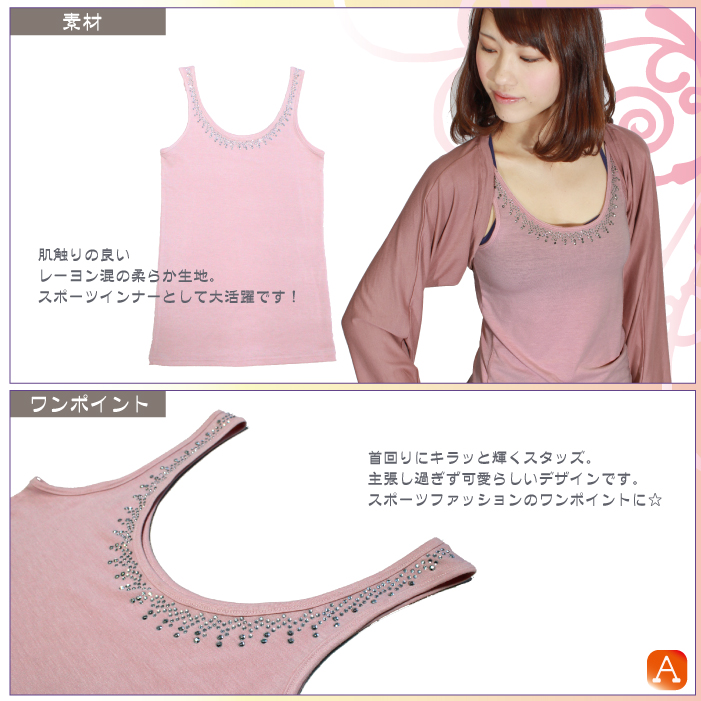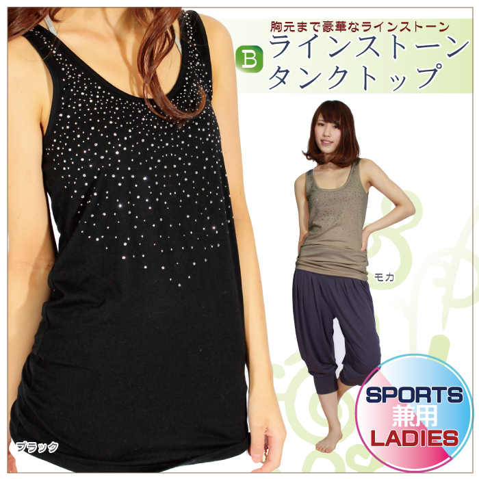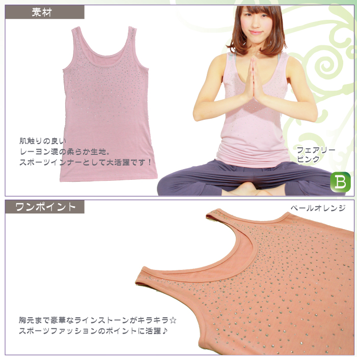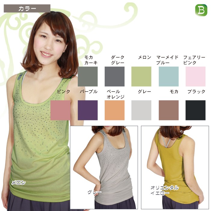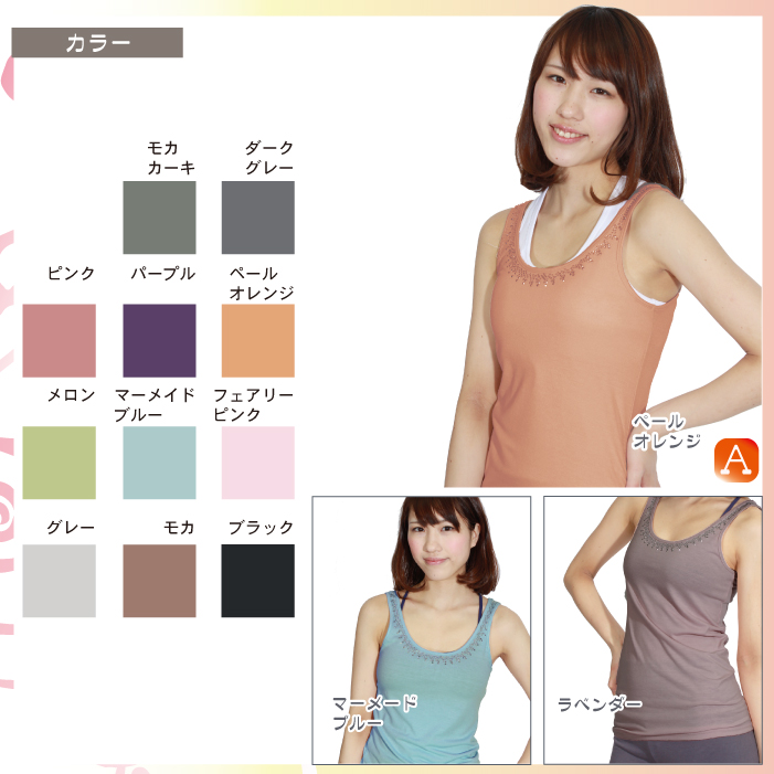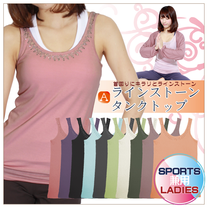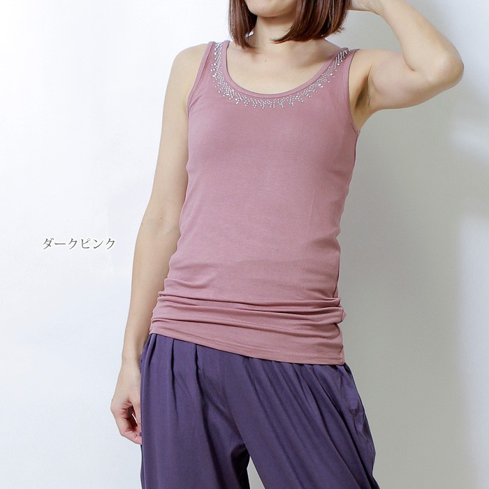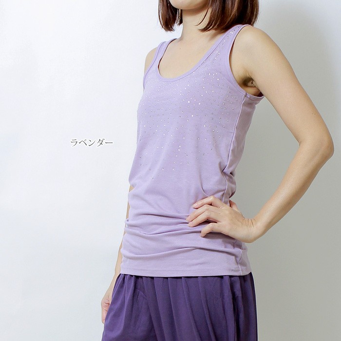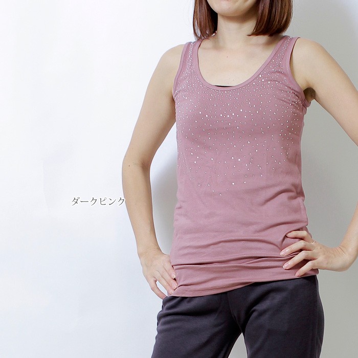 煌めくラインストーンで華やかスタイル♪ 生地感もサラッと着心地がとってもいいです☆ 重ね着アイテムにも使えるし、もちろん1枚でもOK! おしゃれで可愛いタンクトップ、これからの季節にオススメ!