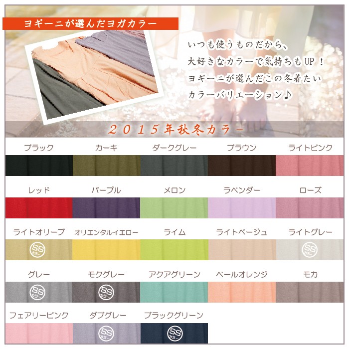 ブラック、カーキ、ダークグレー、パープル、ペールオレンジ、メロン、マーメイドブルー、グレー、モカカーキ、オリエンタルイエロー、ローズ、ラベンダー、フェアリーピンク、ダークピンク