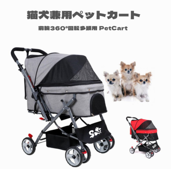 ペットカート 犬用ベビーカー 犬 カート 猫 バギー 猫犬兼用 3way 3色 四輪 対面推し可能 前輪360°回転 後輪ブレーキ付 ポーチ付き 多頭用