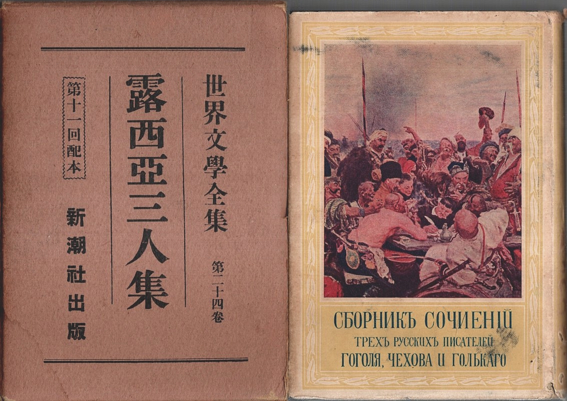 チェーホフ、ゴーリキー、ゴーゴリ/秋庭俊彦・原久一郎:訳 新潮社 1928年 初版 B六 函・カバー付 548頁 函若干焼・少濡れシミ カバー縁若干傷み・若干汚 若干焼シミ 扉頁蔵書印有 本文問題なし 程度並 700g外