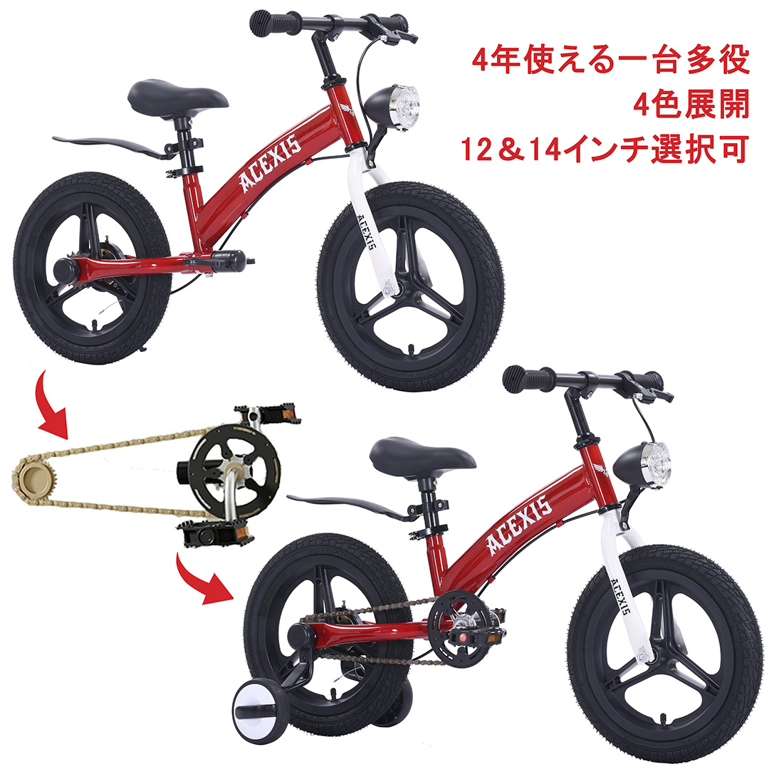 【商品特徴】■3WAYモードチェンジ成長に合わせてモードチェンジが可能。STEP1:キックバイクペダルなしでバランス感覚を身に着けよう!STEP2:補助輪付き自転車ペダルを漕ぐ練習、体幹を鍛えよう!STEP3:通常自転車補助輪を外して自転車デビュー!■簡単組み立て組み立てに必要な工具・組み立て説明書付きで女性一人でもラクラク!所要時間:約15分(大人1人の場合)※ネジを回す際に空回りしないように、別途ペンチをご使用いただけると組み立てやすくなります。ブレーキの練習にも◎男女子向けのカッコいい3in1デザインの子供自転車パンクの少ない2.125インチ幅のワイドタイヤシートポスト、ハンドル高さ等、お子様の成長に合わせて微調整できます。■適応年齢:2-5歳-12インチ(80-110cm) 4-8歳-14インチ(105-130cm)■1年保証の内容初期不良、または通常のご使用条件にて生じた故障・不具合につきましては、無償にて本体交換または新品パーツに交換させていただきます。但し、以下の項目に該当する場合は保証対象外となります。※弊社の保証規定に準じて判断をさせて頂きます。・使用条件、環境を著しく逸脱した状態でご使用になられた上での故障や不具合。・お取り扱い上の不注意、誤った使用方法による故障や不具合。・タイヤのパンクなど、消耗パーツの劣化による故障や不具合。・ご使用中の傷や汚れ。・火災、地震などの天災等に起因する故障や損傷。・お客様の改造による故障や不具合。