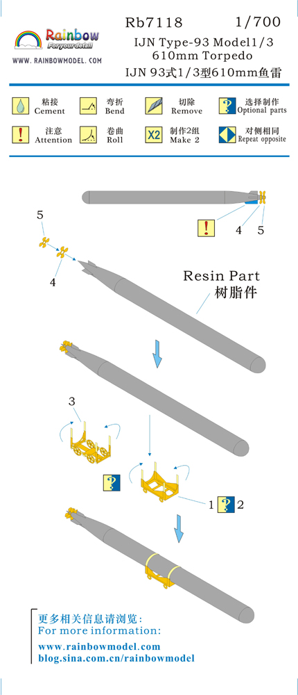 Rainbow Model Rb7118 1/700 IJN Type-93 Model1/3 610mm Torpedo [3DP+PE]