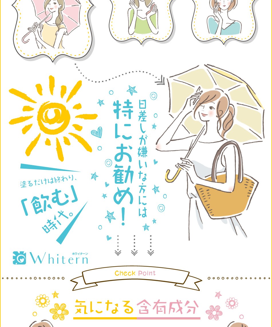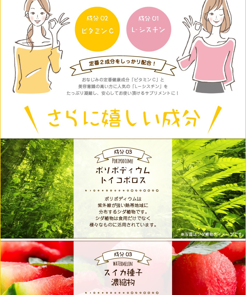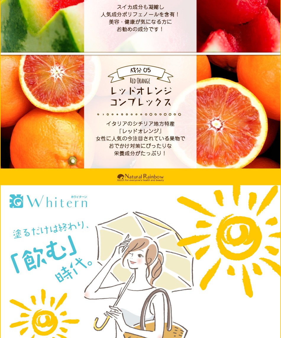原材料名:シダ植物抽出物(ポリポディウムロイコトモス抽出物、マルトデキストリン)(中国製造)、乳糖、レッドオレンジ抽出物(レッドオレンジ抽出物、マルトデキストリン)、デキストリン、ナタネ硬化油、スイカ種子抽出物/L-シスチン、ビタミンC、結晶セルロース、HPC、ステアリン酸カルシウム、微粒二酸化ケイ素、(一部に乳・オレンジを含む)