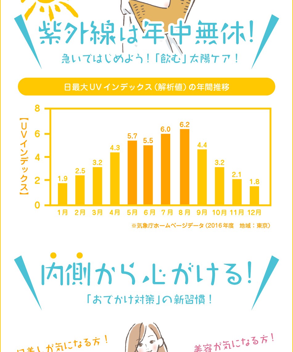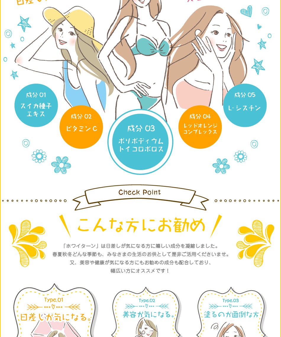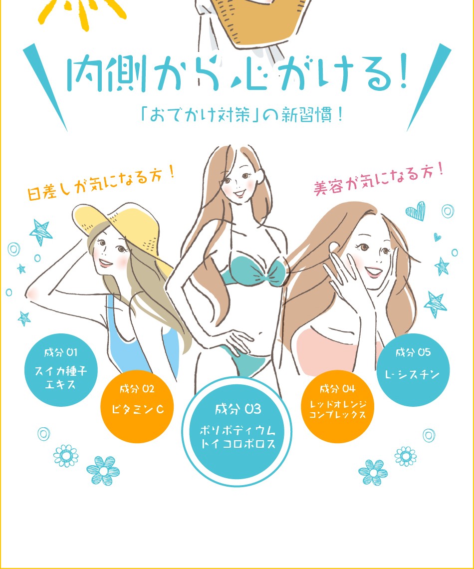 原材料名:シダ植物抽出物(ポリポディウムロイコトモス抽出物、マルトデキストリン)(中国製造)、乳糖、レッドオレンジ抽出物(レッドオレンジ抽出物、マルトデキストリン)、デキストリン、ナタネ硬化油、スイカ種子抽出物/L-シスチン、ビタミンC、結晶セルロース、HPC、ステアリン酸カルシウム、微粒二酸化ケイ素、(一部に乳・オレンジを含む)