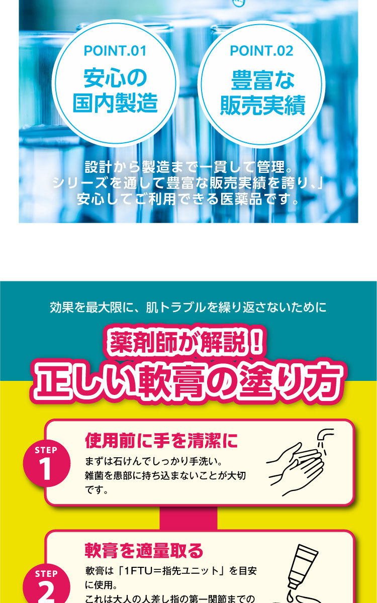 ・大人の人差し指の、先端から第一関節までにお薬を乗せた量(約0.5g)が、大人の手のひら2枚くらいに塗ることができる量の目安です。