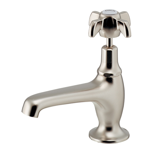 クロスハンドルが特徴的なマットなシルバー色の単水栓です。