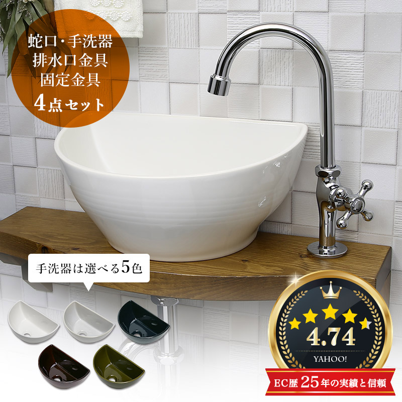 この商品は「蛇口」「手洗器」「排水口金具」「卓上固定金具」の4点セットです。