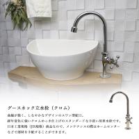 グースネック立水栓は、置き型のクレセント手洗器にジャストサイズ。吐水口には水ハネを軽減する泡沫がついた単水栓です。