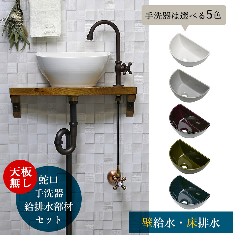 スワン型の蛇口と小ぶりな手洗器、蛇口と同色の給水・排水部材、手洗器用固定金具の6点セットです。