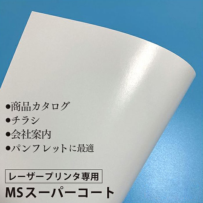 レーザープリンタ用 MSスーパーコート紙(両面)レーザープリンター用の表面にツヤのある半光沢のコート紙です。従来品より白色と耐熱温度を高めた半光沢のコート紙(両面)。チラシやカタログなどによく使われているツルっとした用紙です。商品カタログ・チラシや会社案内・パンフレットに最適です。チラシの場合は104.7g(0.1mm)・カタログや会社案内などは157g(0.17mm)が一般的に使用されています。