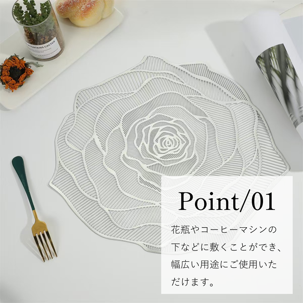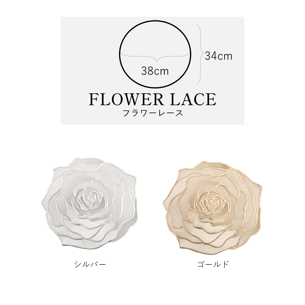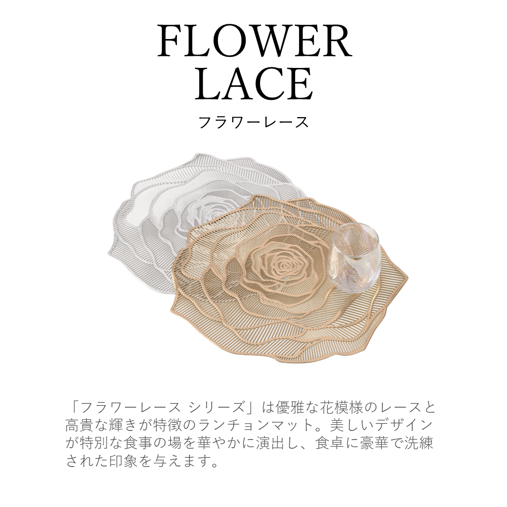 「フラワーレース シリーズ」は優雅な花模様のレースと高貴な輝きが特徴のランチョンマット。美しいデザインが特別な食事の場を華やかに演出し、食卓に豪華で洗練された印象を与えます。