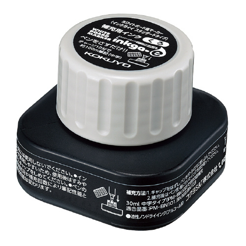 ●コクヨホワイトボード用マーカー<インクガイイスタンダードタイプ>(PM-BN101D・BN102D・BN103D)専用補充インクです。●キャップを開けたままでもペン先が乾きにくいノンドライインクを採用。コピー黒板で印刷してもしっかり写るインクです。●ひとつのボトルで細字・中字・太字タイプのインク補充ができます。中字タイプ(PM-BN102D)で約10回の補充ができ、経済的です。