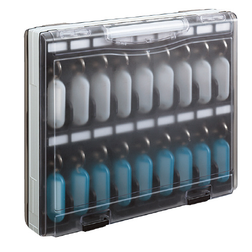 透明フタタイプ 鍵36個収容可能●外寸法/W310×D64×H262mm●スタンダードタイプに比べ2倍収容できるダブルタイプには36個のキーホルダー型名札がついています。●キャビネットや引き出しにすっきり納まるサイズなので、オフィスでの仕様に最適です。必要に応じて出し入れできる取っ手がついているので持ち運びも簡単です。