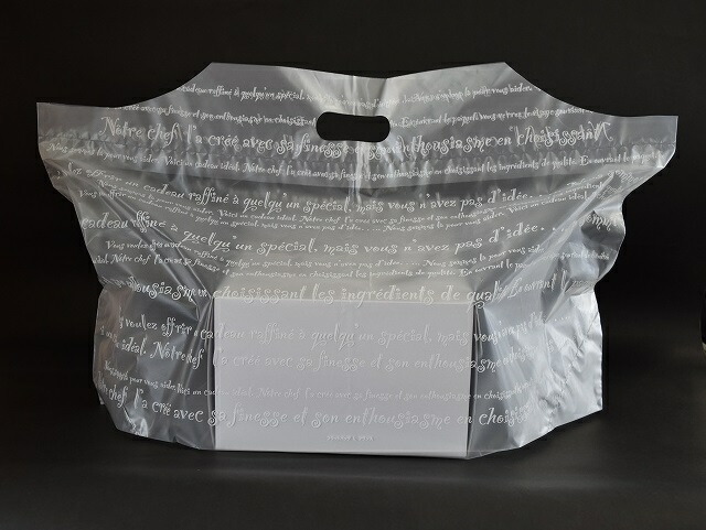 特長 :半透明に白文字が印刷されたシンプルな手提げ袋です。