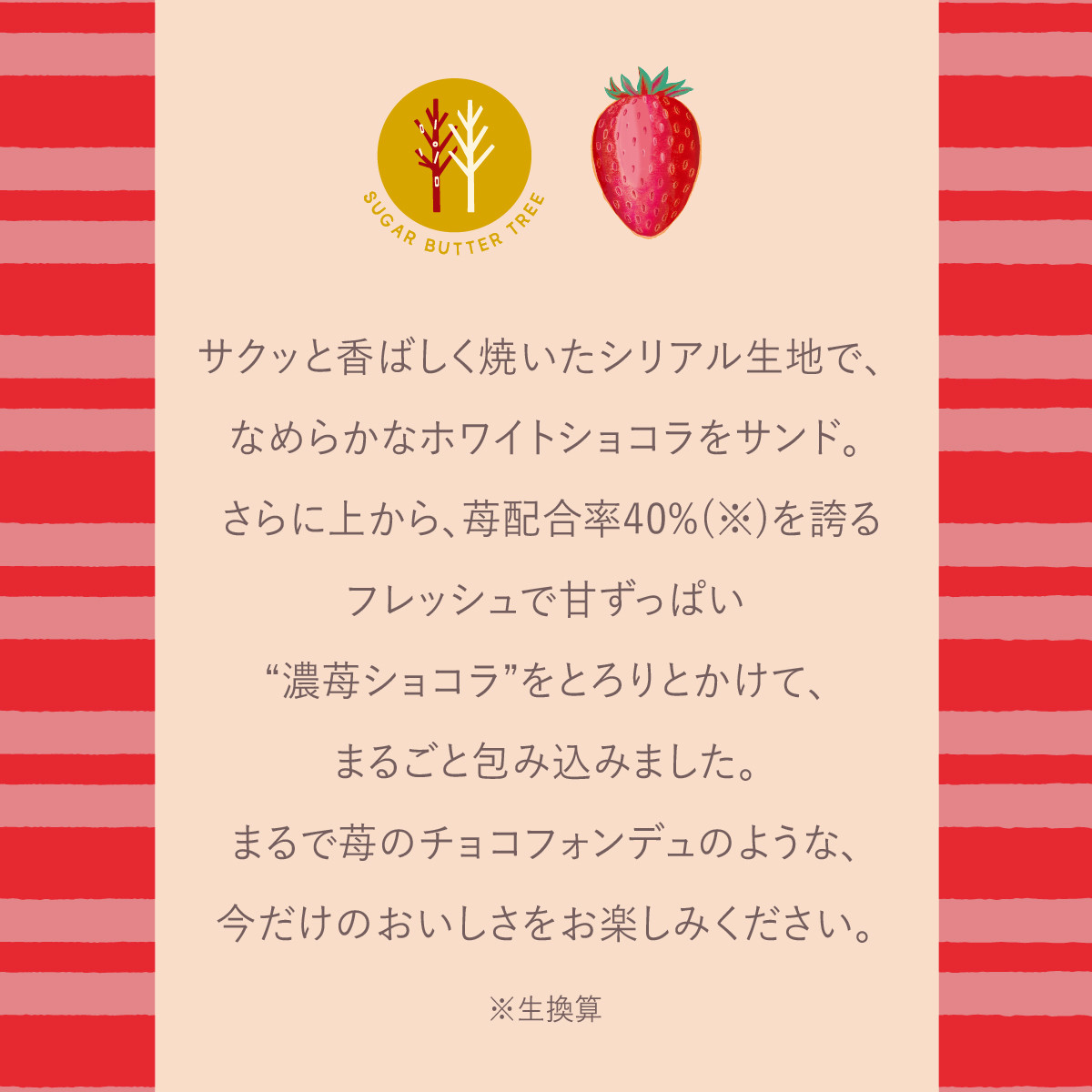 | 原材料 | 準チョコレート(国内製造)、小麦粉、バター、ライ麦粉、加工油脂、小麦全粒粉、粉糖、砂糖、精製加工油脂、苺パウダー、からす麦粉、パン粉、脱脂粉乳、食塩、酵母、コーングリッツ/乳化剤(大豆由来)、香料、酸味料、酸化防止剤(V.E)、イーストフード |