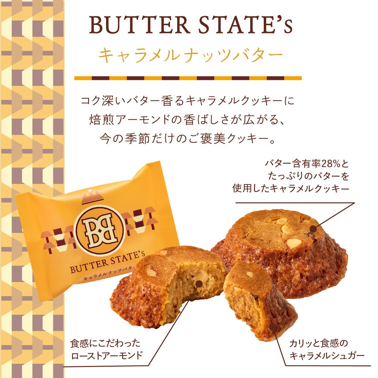 【バターステイツクッキー キャラメルナッツバター】 熱量 108kcal たんぱく質 1.2g 脂質 6.5g 炭水化物 11.3g 食塩相当量 0.07g