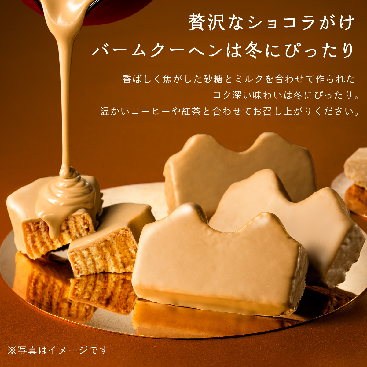 【ひとくちマウントバーム〈ゴールドショコラ〉】 チョコレート(ベルギー製造)、砂糖、加工油脂(植物油脂、バター、精製加工油脂、脱脂粉乳)、小麦粉、卵白加工品(卵白、食塩)(卵を含む)、加糖卵黄、アーモンドパウダー、バター、精製加工油脂、でん粉、乾燥卵白、食塩/トレハロース、乳化剤(大豆由来)、香料、膨張剤、環状オリゴ糖、酸化防止剤(V.E)、カロテノイド色素 ※くるみを使用した設備で製造しております。 |