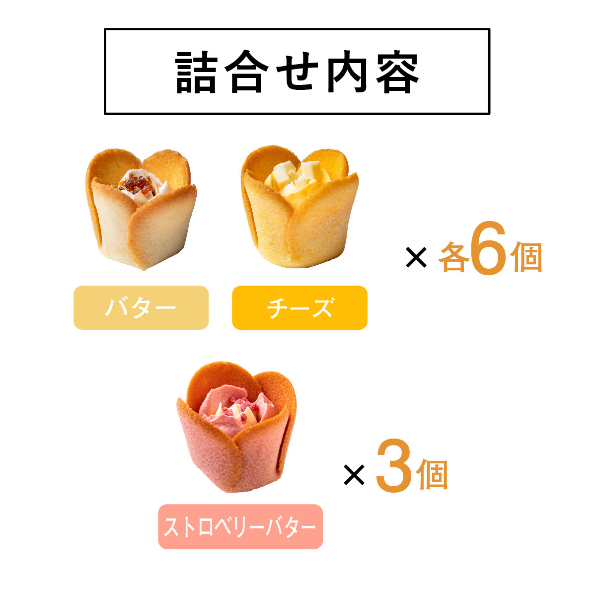 | 内容量 | ●チューリップローズ バター・チーズ 各6個 ●チューリップローズ ストロベリーバター 3個 |