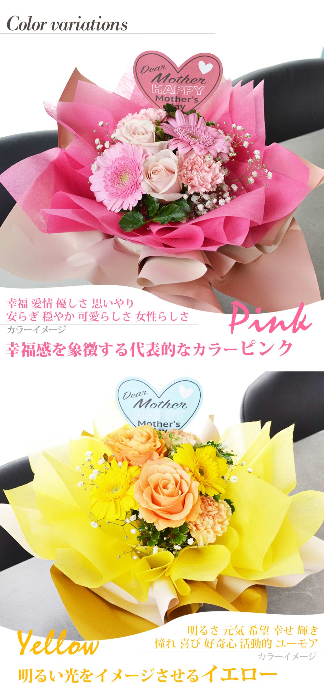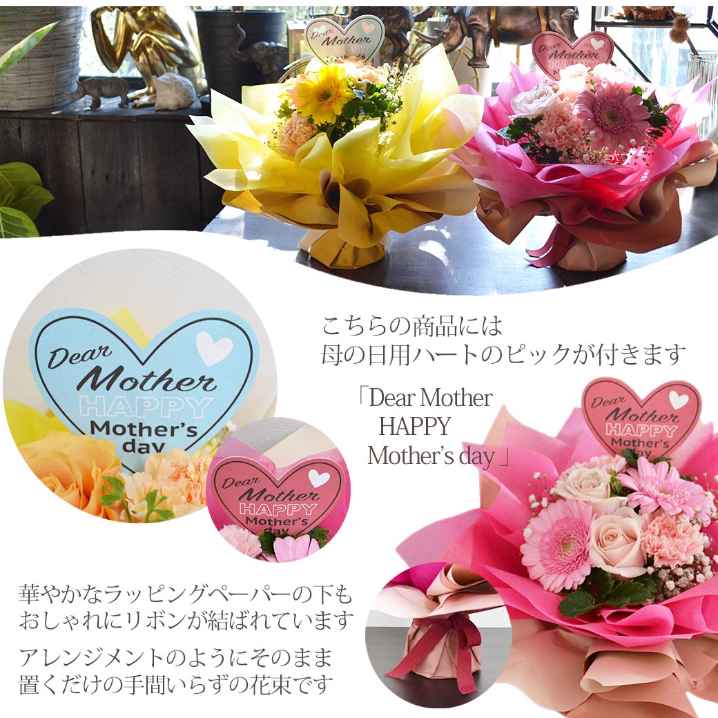 ![]() 2025年 母の日 おすすめフラワーギフト そのまま飾れる花束「ハッピーブーケ」 花瓶がなくてもOK!華やかなラッピングのまま飾れる自立する花束です。 花束は保水ゼリーが入ったカップに入れてペーパーやリボンでラッピングしています。 届いたらそのまま置くだけ!手間いらずの花束。 水やり不要でしばらくの間そのままお楽しみいただけます。 ※保水ゼリーが少なくなりましたらゼリーは可燃物として破棄し、カップに水を入れて飾ってください。 ▼商品内容 そのまま飾れる生花スタンディングブーケ (バラ カーネーション ガーベラ カスミソウ) ピンクかイエローのどちらかをお選びいただけます 母の日のメッセージピックが付きます。 お取扱い説明書をお付けします。 ▼サイズ 幅:約33cm 奥行:約33cm 高さ:約30cm ※入荷状況により花材や資材等は多少変わる場合がございます。 ※花の大きさや花付きや色、開花状況など、また手作りのため個体差がございます。予めご了承ください。 ▼お届け期間 2025年5月9日(金)〜2025年5月11日(日) お届け日指定OK! ※お届け日指定につきましては各日数量限定のためお早めにご予約ください。 ※時間指定につきましては繁忙期のためご指定いただけません。 ※5月9日(金)18時までのご注文は母の日までのお届けOK! ※5月9日18時以降のご注文は遅れてごめんね母の日となり順次発送致します。 ▼お届け地域:日本各地(沖縄県・一部離島を除く) ※現在、沖縄・一部離島へのお届けは承っておりません。 ▼返品・交換について 商品が届きましたらすぐに箱を開けてご確認ください。 細心の注意を払っておりますが、万一お届けの際に不備がございましたら商品到着後2日以内に ご連絡いただくよう品質保証のしおりを同梱させていただいております。 恐れ入りますが、お花の状態を撮影していただき、お早めにメールかお電話にてご連絡ください。 レビュー投稿では対応が遅れてしまいますので、お届け後2日以内に当店に直接ご連絡をお願いいたします。 ▼その他 ・当店では全てギフト配送しております。金額のわかる明細等の伝票類はお入れしておりません。母の日ギフトにも安心してご利用ください。 ・繁忙期及び定型商品のため画像配信の対象外です。 ▼ご用途/年代 母の日 ギフト プレゼント ははの日 贈り物 母の日ギフト フラワーギフト 花ギフト お母さん 義母さん 母 祖母 叔母 40代 50代 60代 70代 80代 90代 ▼商品スタイル 花束 ブーケ ぶーけ スタンディングブーケ スタンドブーケ そのまま飾れる花束 自立する花束 花瓶いらず 花瓶不要 卓上花 おしゃれ お洒落 オシャレ 可愛い かわいい 洋風 パリ風 フレンチ ラウンド モダン 人気 華やか ▼サービス 送料無料 配達日指定可 お届け日指定OK 日にち指定 宅配 通販 メッセージ ラッピング ギフト配送 |
