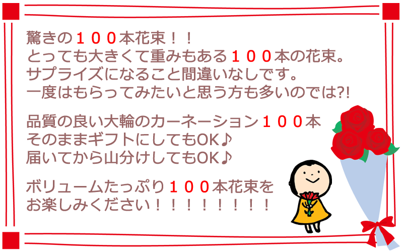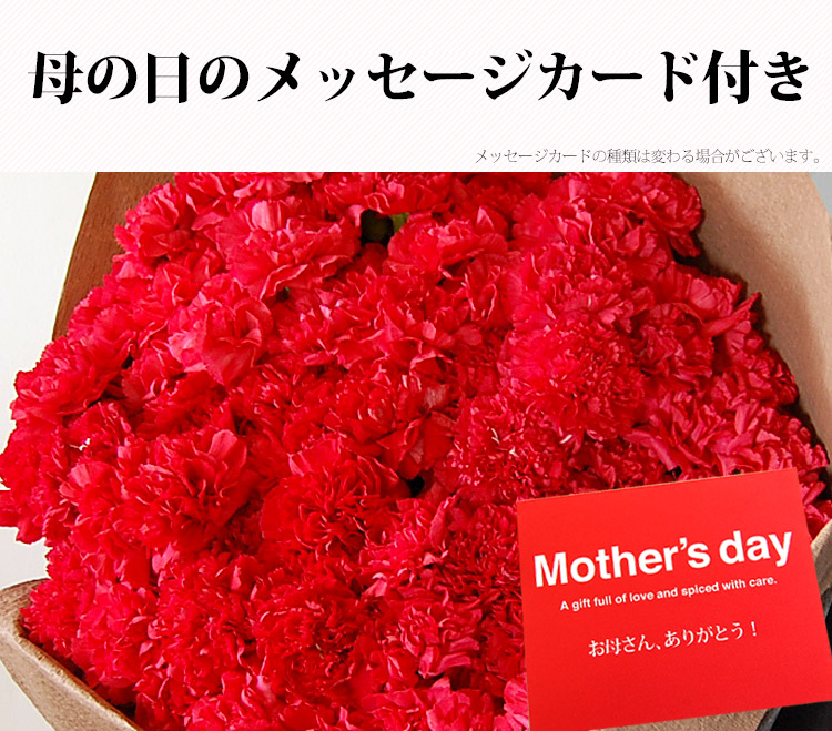 | 【お届け時の花に関してご了承ください。】 母の日ギフトとしてお届けするカーネーションは、その年の状況により写真のようにまだ完全に開花していない状態のものや逆に満開に近いものがございますことをご了承くださいませ。 それぞれ、完全に開花していないものは届いた時のボリュームはなくてもだんだんと花開く様子がお楽しみ頂けますし、満開に近いものは届いた時のボリュームに感動があります。 自然由来の商品のため、ご了承いただきますようお願い致します。 |