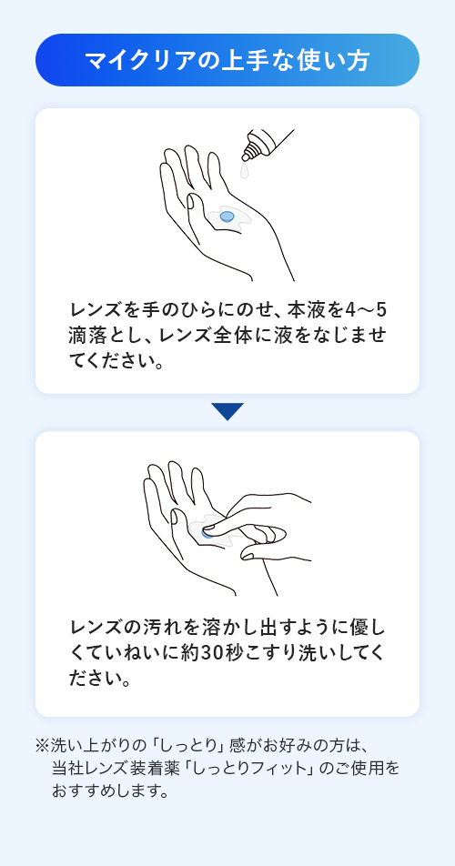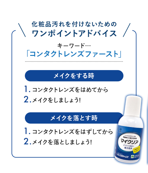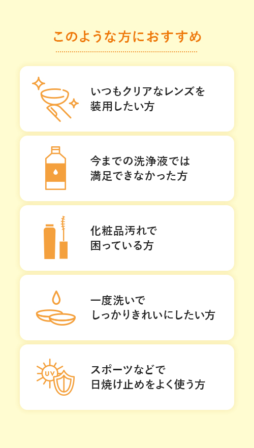 いつもクリアなレンズを装用したい方、スポーツなどで日焼け止めをよく使う方、化粧品汚れで困っている方などにオススメです。