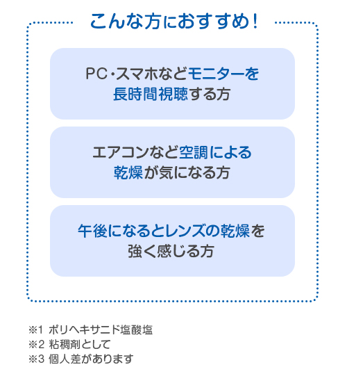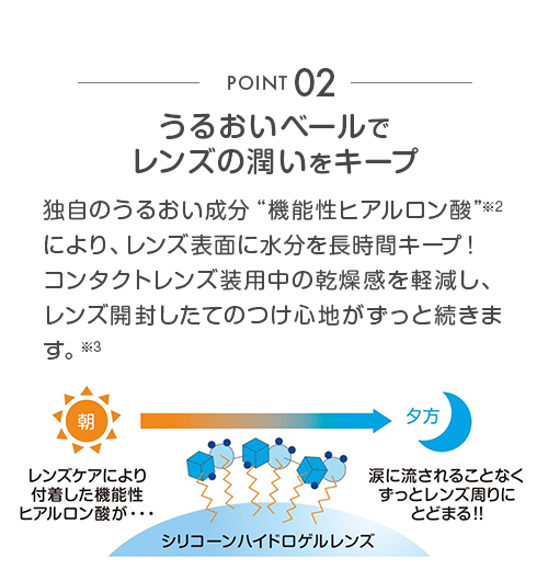 潤いを保つ機能性ヒアルロン酸を配合しました。レンズ表面に水分を長時間滞留させ、レンズの親水性を保持します。